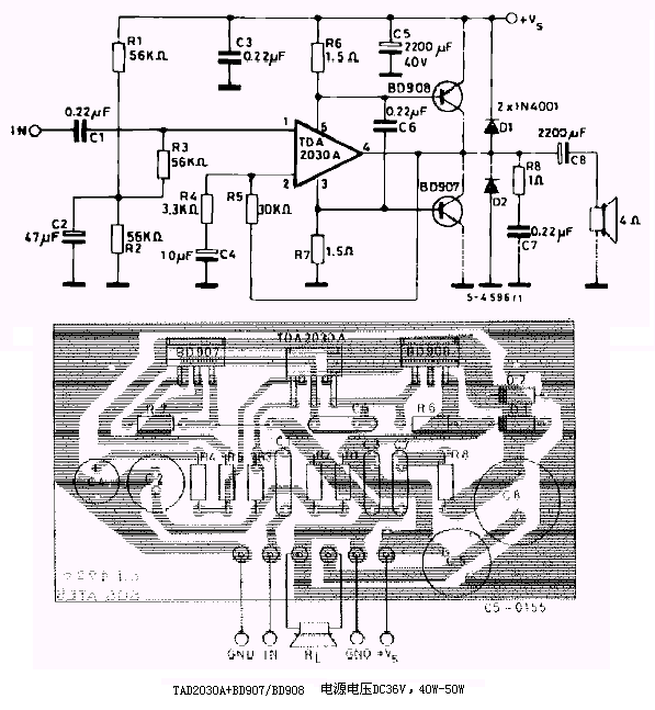 电路中采用单电源供电,大功率输出电路。RL=4欧姆,VS=39V,P0=35W;VS=36V,P0=28W;